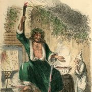 Spirit of Christmas Carol Present: This is a fairly comprehensive version of the original tale, including a lot of things I love to see. A couple in particular caught my ear and eye: not many productions leave in the comment by Marley that he’s procured this chance for Scrooge, with Ebenezer replying, “Thank ‘ee, Jacob.” It’s a sweet note of grace early on. This is one of the very few adaptations that manage to leave in Scrooge being taken by Christmas Present to a coal mine where the workers are singing carols together (alas, we don’t also get their visit to a lighthouse, as in the original). And Christmas Present here gives us a brief glimpse of those starving, near-feral children, Ignorance and Want—less unsettling than the Disney version I watched earlier this year, and I think therefore more affecting?